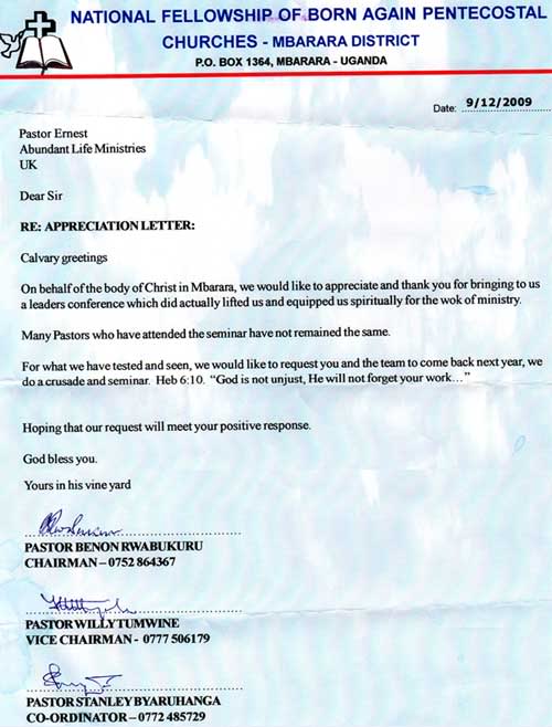 Florence (Hannington's wife) testifies to God healing her womb miraculously when you laid your hands on her.